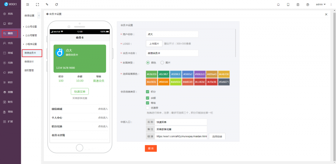 8、在管理后臺(wxx1.com)管理后臺【微信】-【微信會員卡】點擊創建會員卡,填寫設置信息后點擊提交即可創建完成