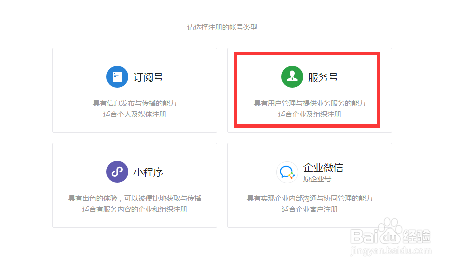 4、了解訂閱號、服務號和企業微信的區別后,選擇想要的帳號類型,點擊中間的服務號;